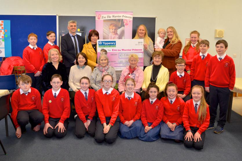 There was a lovely welcome at the Gaelscoil Thiobraid Arran for Eve The Warrior Princess, her mammy Sabrina and Nanny Jacqui to accept a fundraising cheque for €558.70.