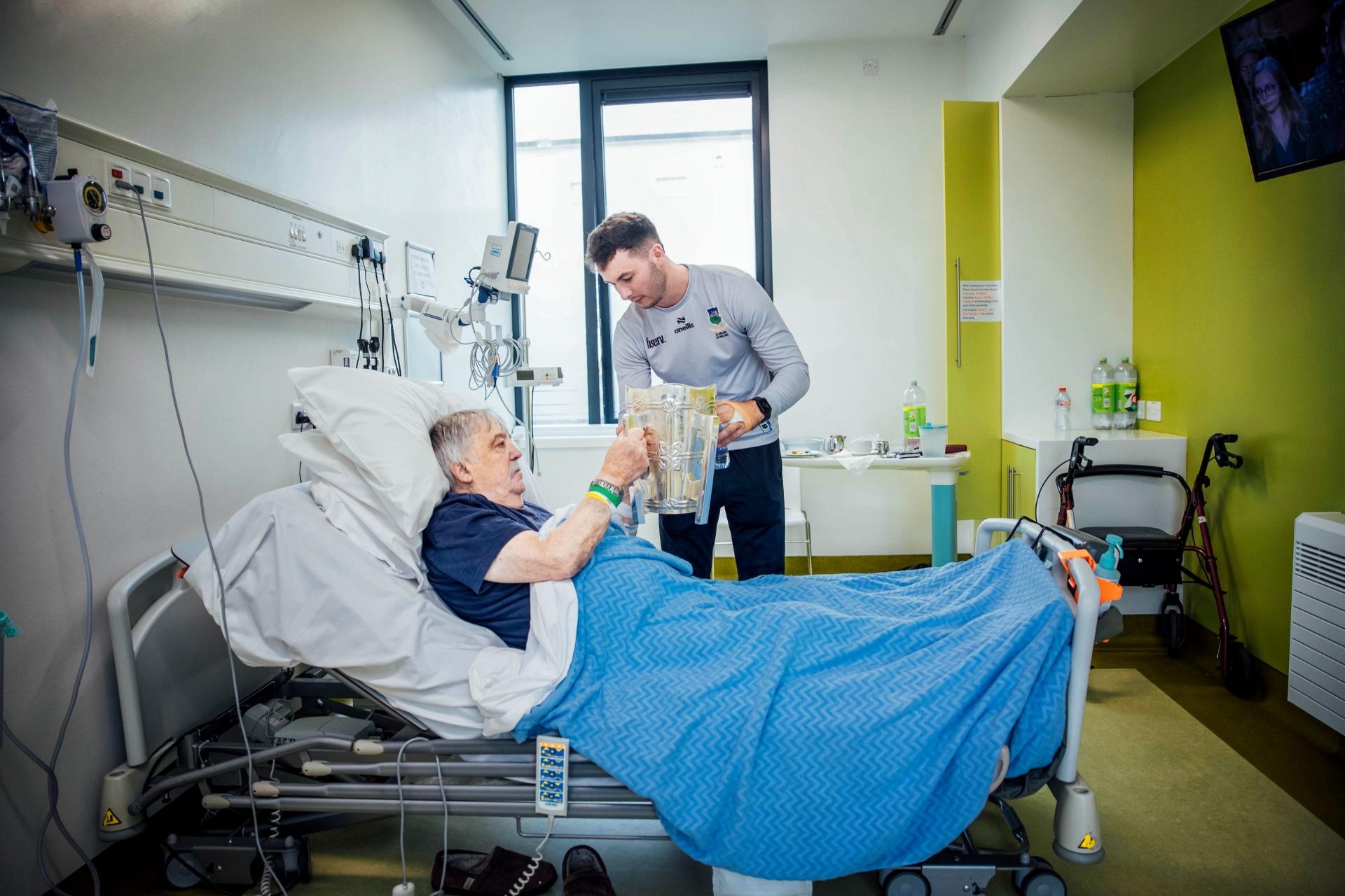 Tipperary hurler Craig Morgan presents the Liam MacCarthy Cup to patient Patrick ‘Pat’ Nugent.