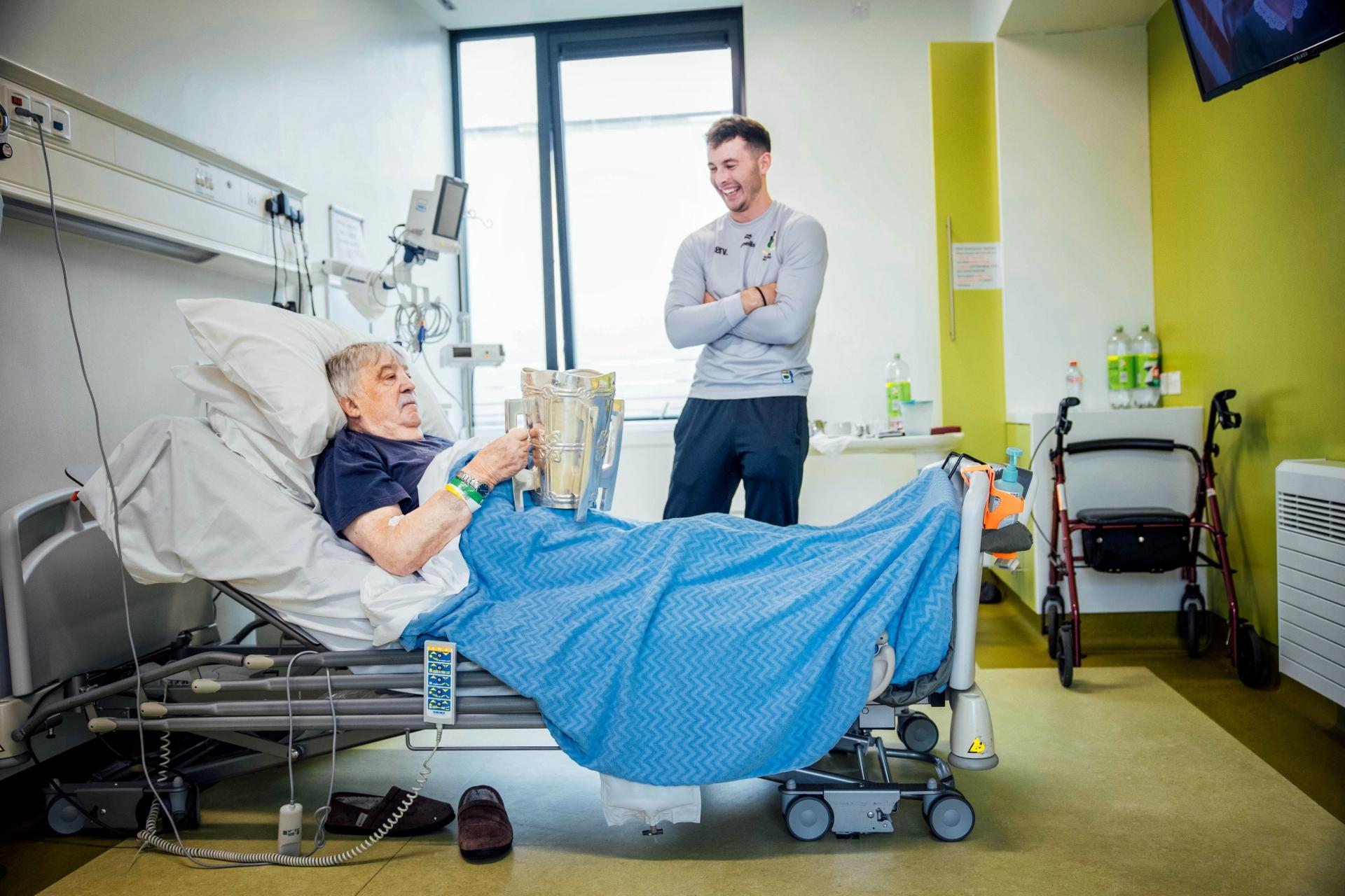 Tipperary hurler Craig Morgan presents the Liam MacCarthy Cup to patient Patrick ‘Pat’ Nugent.