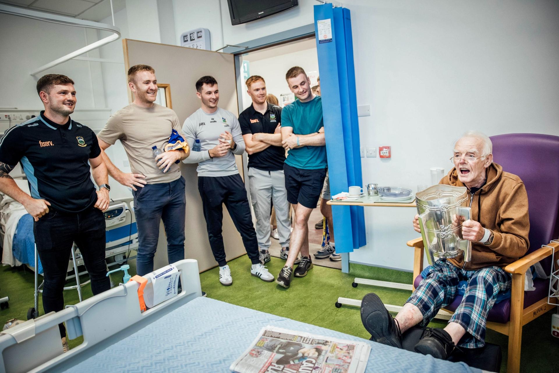 John Ferncombe proudly holds the Liam MacCarthy Cup during a visit by some of the victorious Tipperary senior hurlers to Nenagh Hospital.