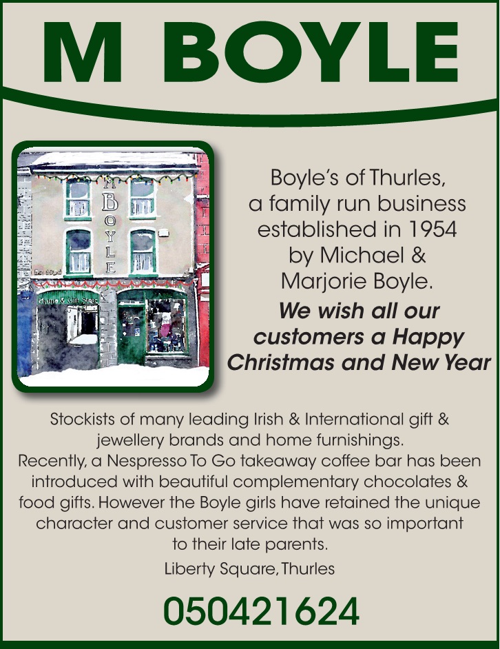 Call in to and see for yourself, M. Boyle, Liberty Square, Thurles. Tel: 0504-21624