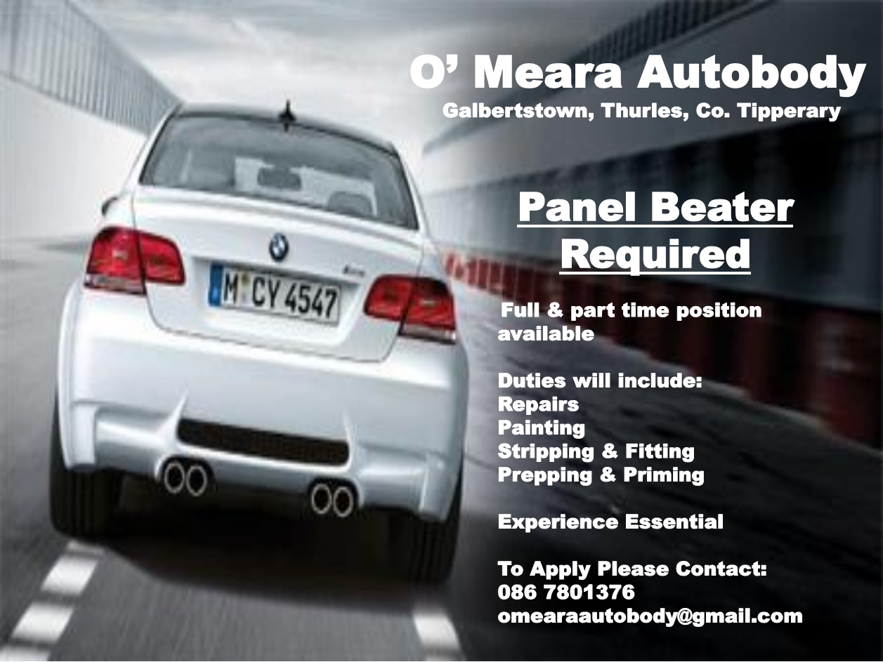 O’Meara Autobody, Galbertstown, Thurles, Co. Tipperary are expanding their team and would like to hire a Panel Beater. Full and part-time position available.