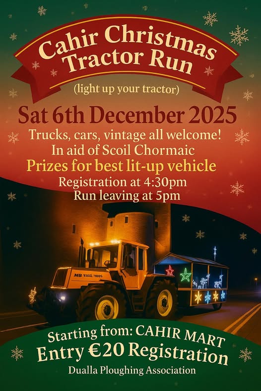 Tractors, trucks, cars and vintage vehicles and their drivers are invited to take part in the Cahir Christmas Tractor Run in aid of Scoil Chormaic in Cashel on Saturday, December 6.