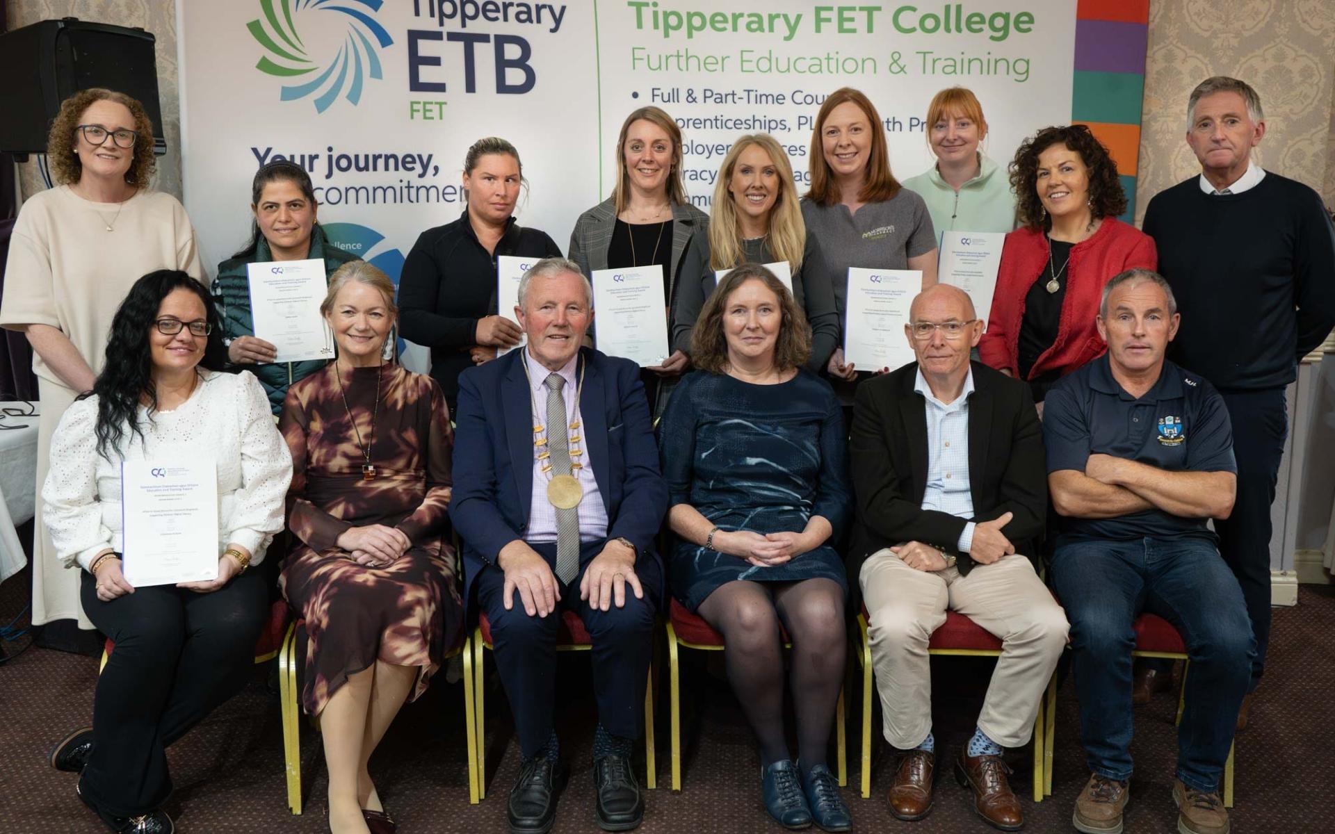 Tipperary FET College graduates of the Level 3 Family Learning course at the annual awards ceremony in Cahir on 23 October. Back L to R: Ann Marie Sweeney, Tipperary FET College; Amal Saad, Anne Marie Delaney, Sinead Halpin, Niamh Falvey, Tracey O'Connor, April St. John, Jacinta Byrnes, HSCL Bunscoil na Cathrach; Peter Cleary, Tipperary FET College. Front L to R: Siobhán Ronan, Mary Roche Cleary, Tipperary FET College; Roger Kennedy, Tipperary ETB Board Chairperson; Deborah Ryan, Tipperary FET College; Noel Colleran, Tipperary FET College; Martin Halpin, Caretaker Bunscoil na Cathrach.