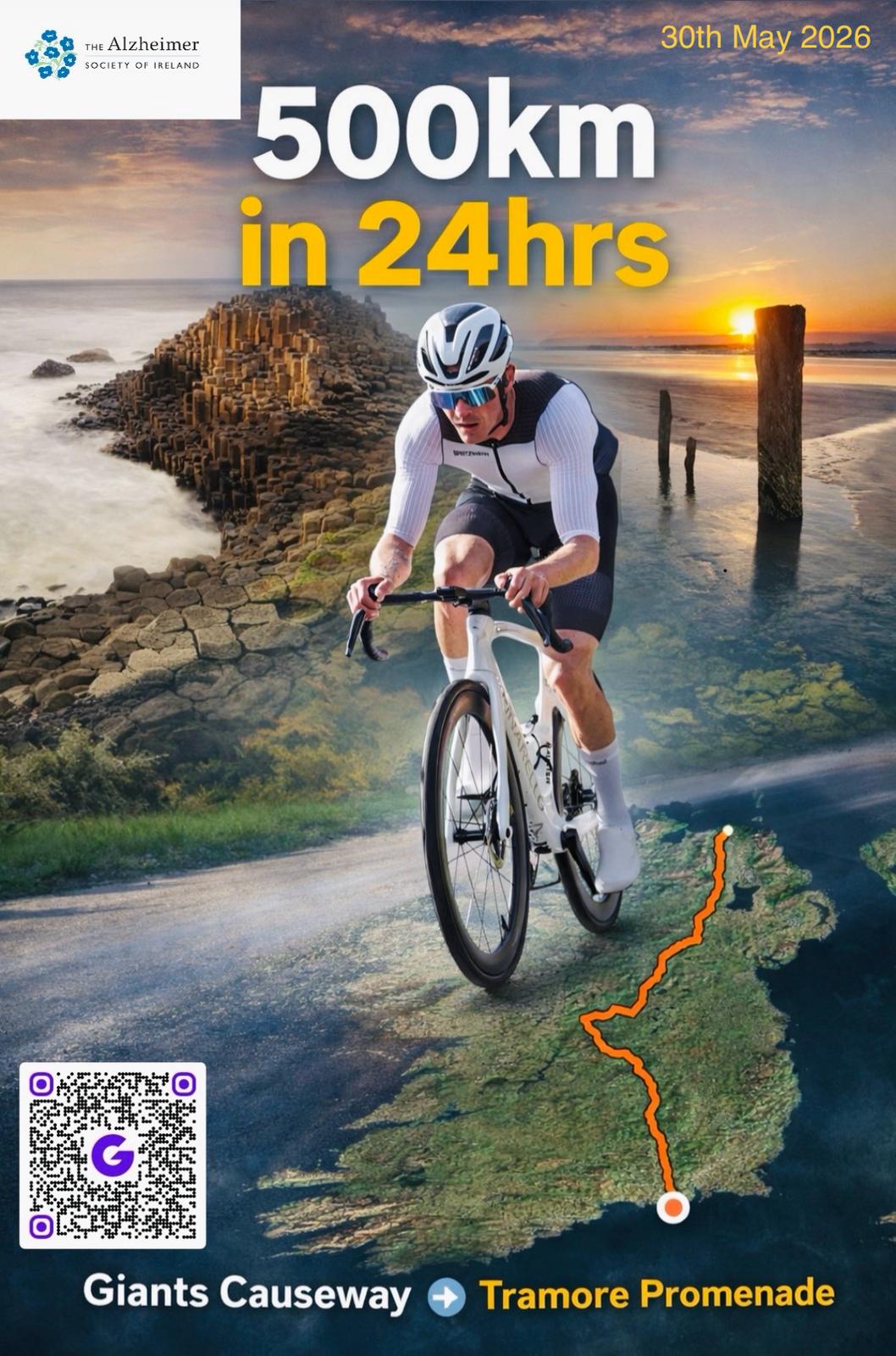 Cycling 500km from Ireland's north coast to its south coast is an epic feat for any athlete but 32-year-old John Dowley has set himself the even more Herculean challenge of completing the journey in 24 hours to raise funds for the Alzheimer Society of Ireland.