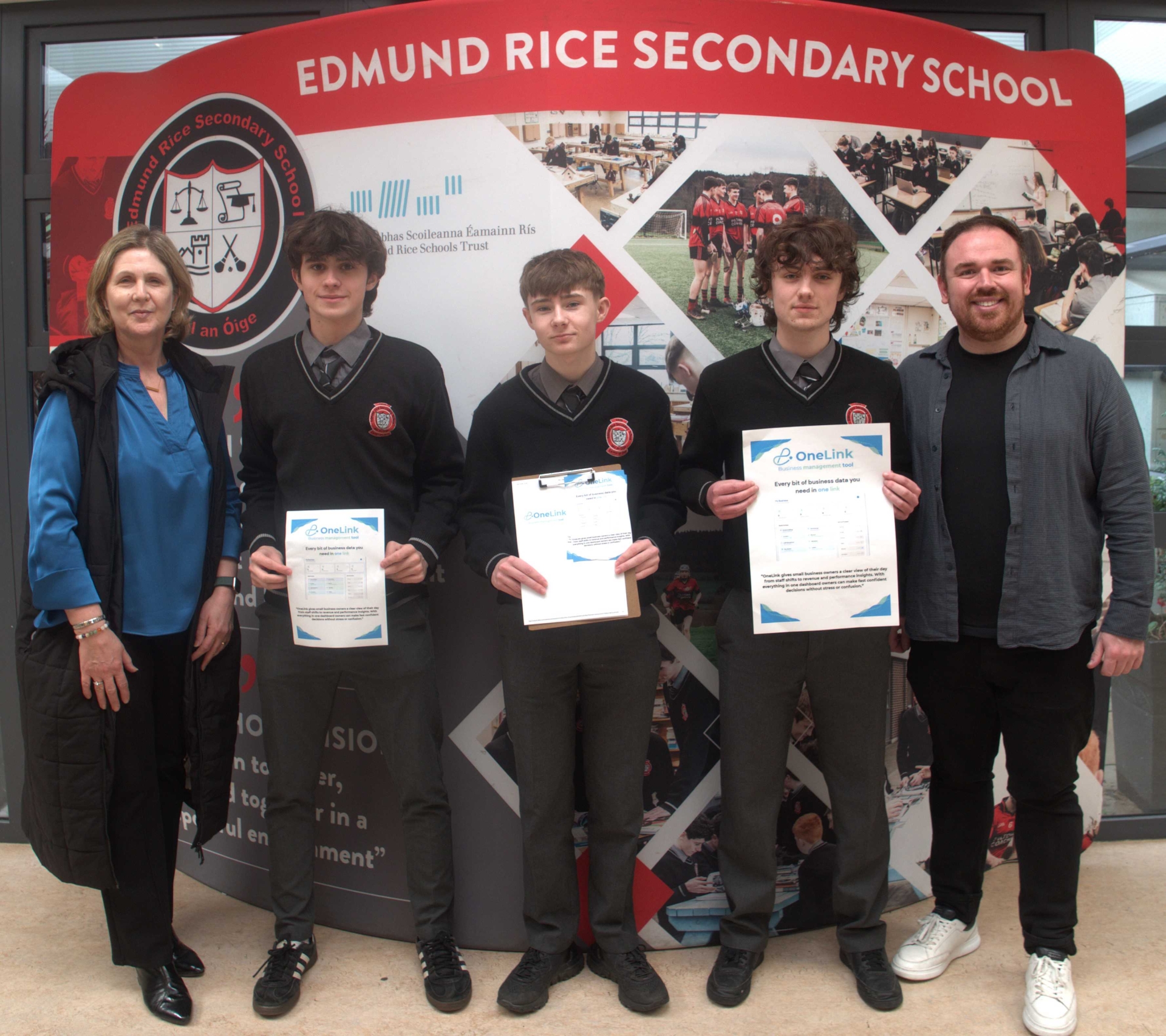 Judge Tina Mulhearne of Tipperary Local Enterprise Office with the winners of hte Best Innovation & Concept award One Link, a business management tool company run by Sean Flynn, Oisín Hayde and Evan Walsh. ERSS teacher Ronan Guilfoyle is pictured on far right.