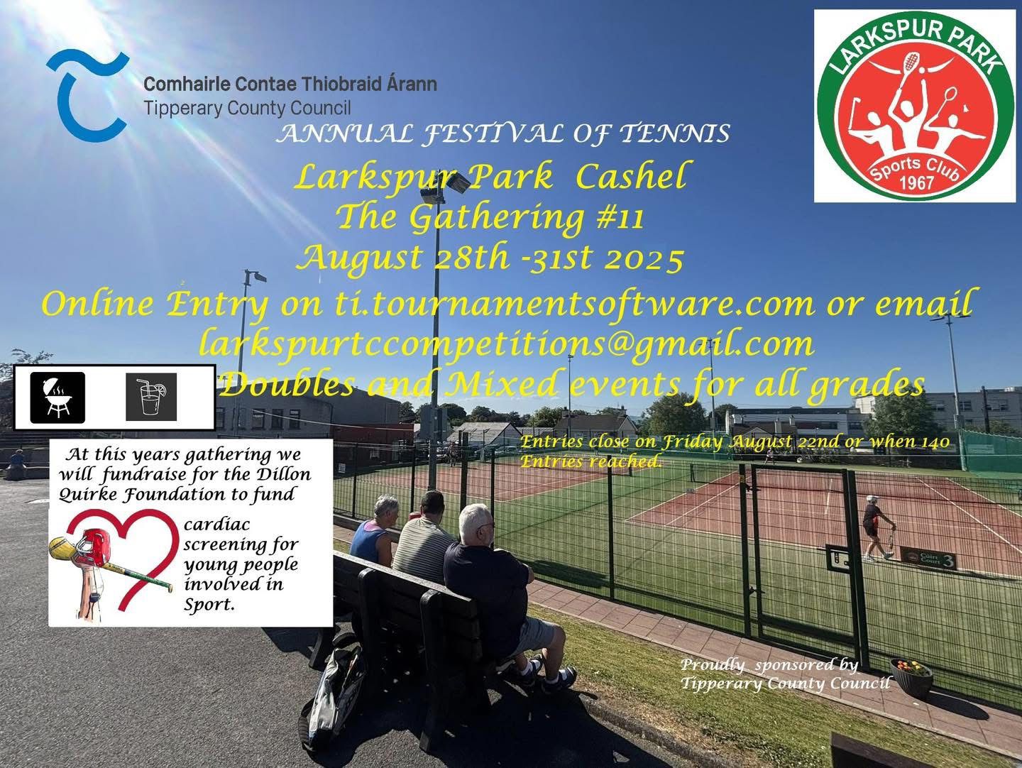 Larkspur Park Tennis Club annual tournament, known as The Gathering, is now open for entries as the club looks to have another successful year of raising vital funds for local causes.