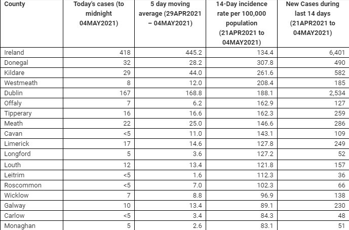 As of midnight, Tuesday, May 4, the HPSC has been notified of 418 confirmed cases of Covid-19. There is now a total of 251,087* confirmed cases of Covid-19 in Ireland.
