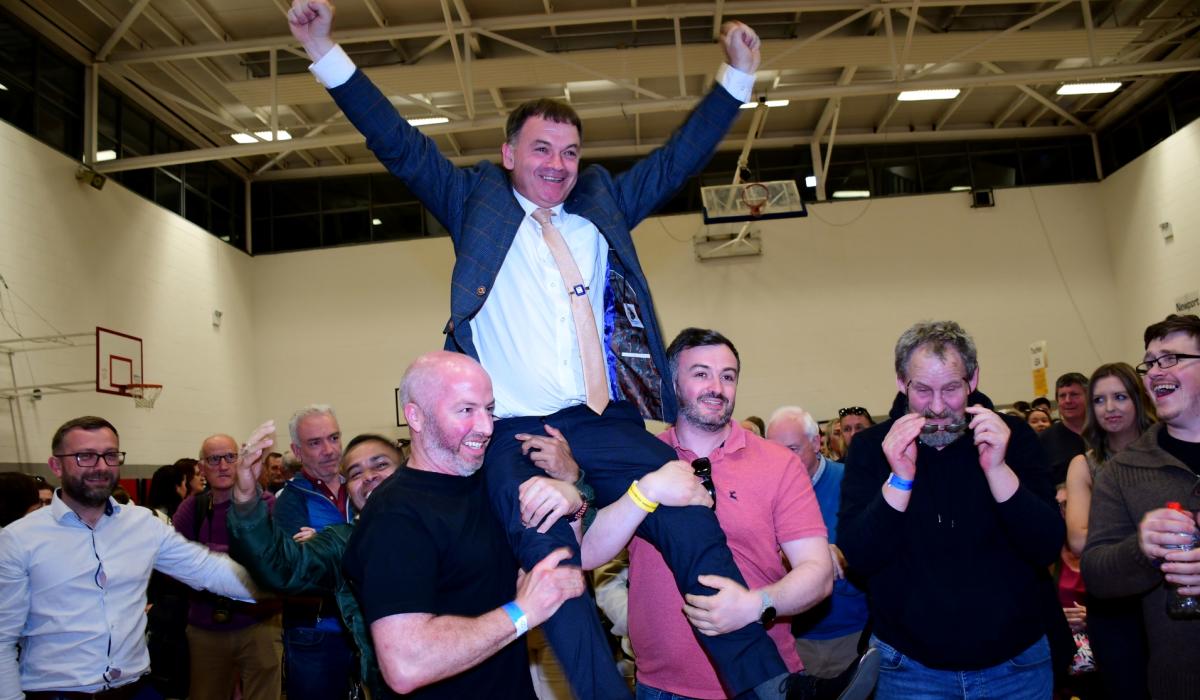 A delighted Cllr David Dunne is hoisted on the shoulders of supporters following his re-election to Tipperary County Council on the first count last Saturday night. Picture: Eamonn McGee