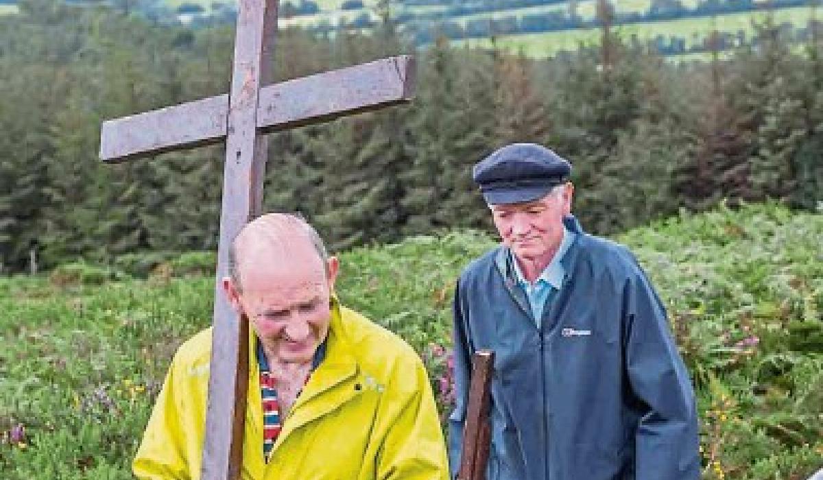 Philly Prout and Fr. Iggy O’Donovan carrying crosses on the pilgrimage to Holy Year Cross on Slievenamon