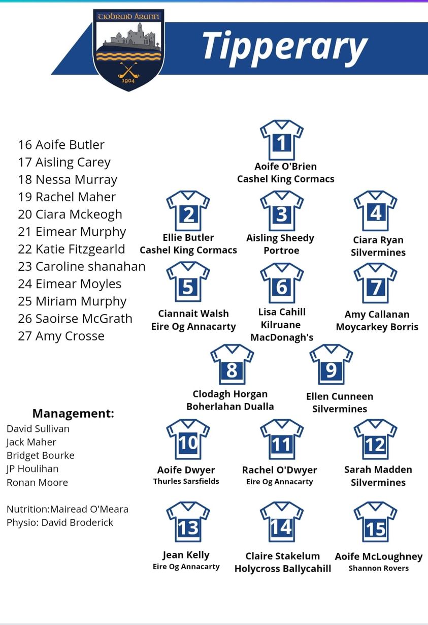 This evenings game is sure to be an exciting one and Tipp line out with the two captains, Clodagh Quirke and Karen Kennedy, in the central positions in defence. Casey Hennessy is in centre field alongside Teresa Ryan while Caoimhe Maher leads the attack. The game gets underway at 4.30pm