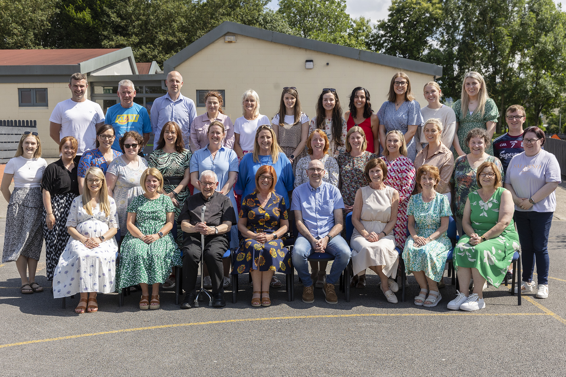 Above: Current staff of St Oliver’s National School in Clonmel, with former board of management chairman Fr Michael Hegarty, at the recent event in the school to mark the retirement of long-serving teachers Angela Quinlivan, Diarmuid O’Keeffe and Debbie Swift