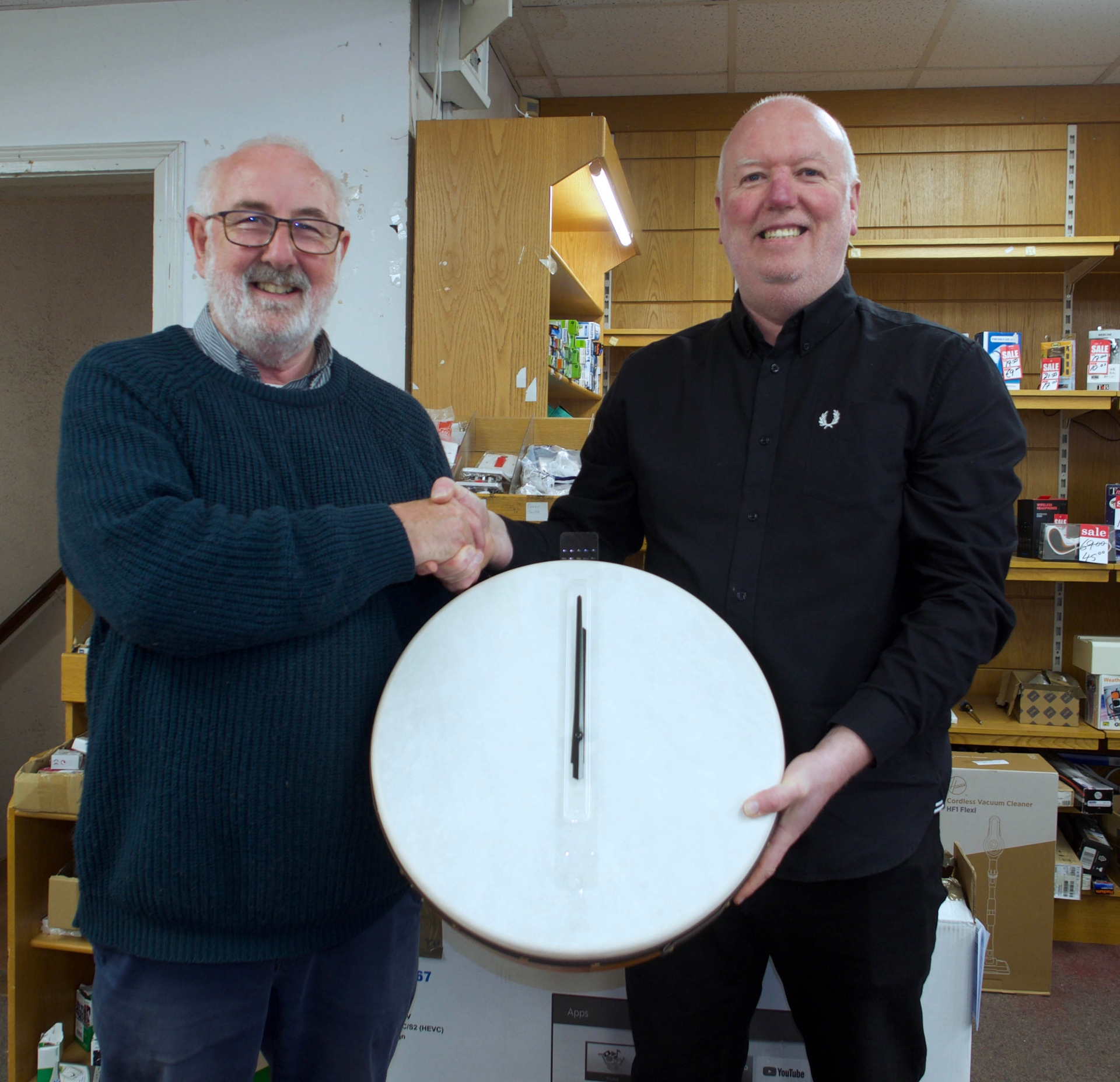 Pictured below: Seamus Campbell of Carrick-on-Suir Business Association (right) presents a retirement gift of a bodhran clock to Jim Butler. Pictures Anne Marie Magorrian