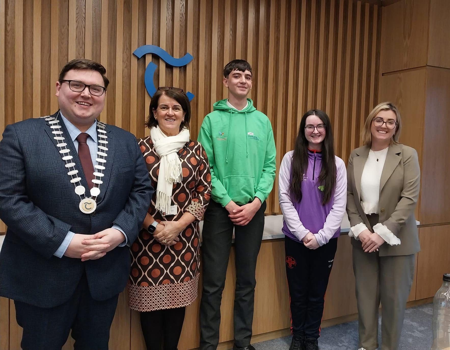 Council Cathaoirleach Cllr Declan Burgess, Tipperary Comhairle na nÓg Co-ordinator Pauline Strappe, Tipperary Comhairle na nÓg members Michal Kolodziejczak and Chloe Duggan, Cllr Máirín McGrath