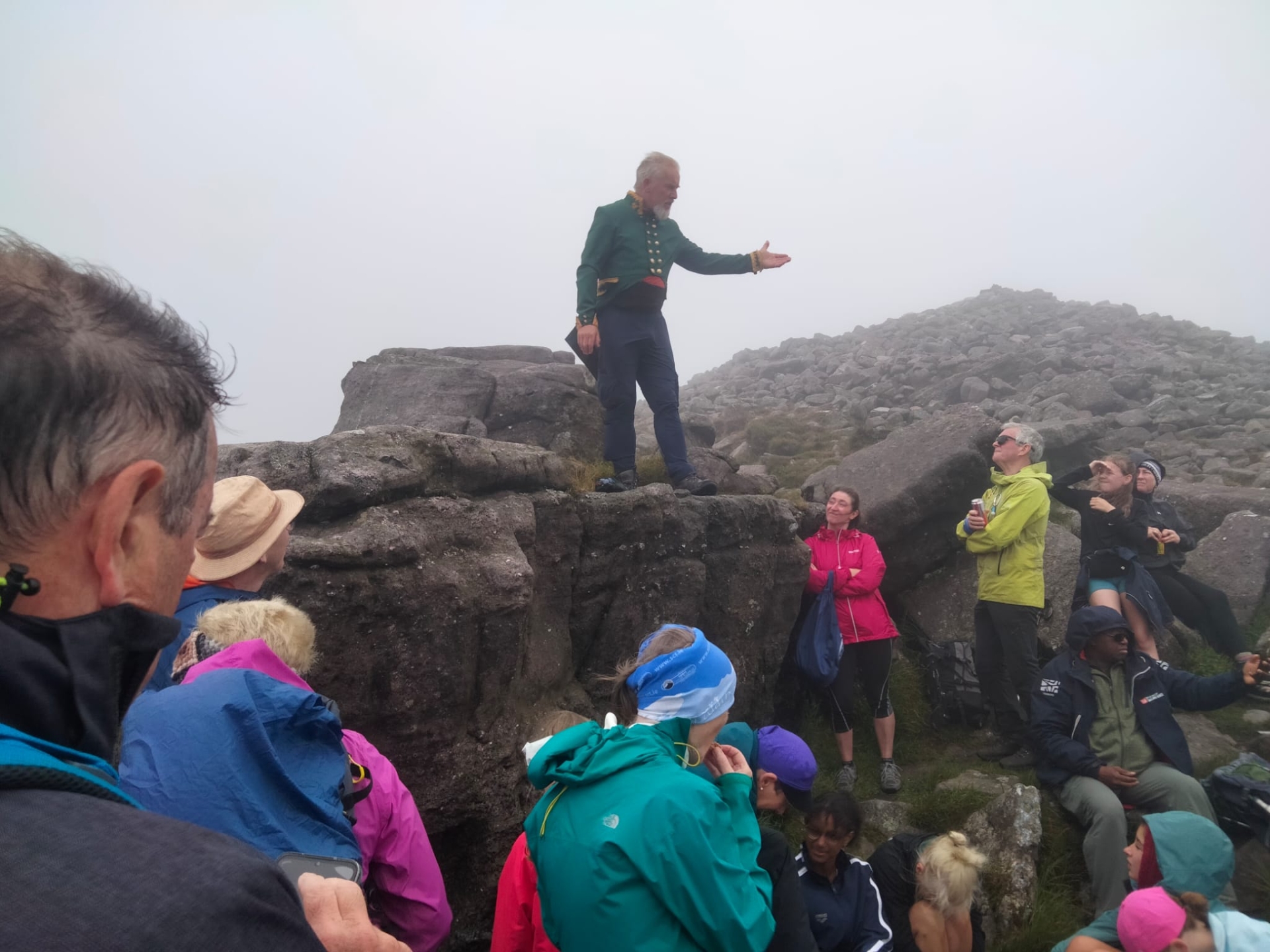 Historian Dr Thomas McGrath (in blue jacket and cap) addressing the Slievenamon Day hikers at the summit of Slievenamon.