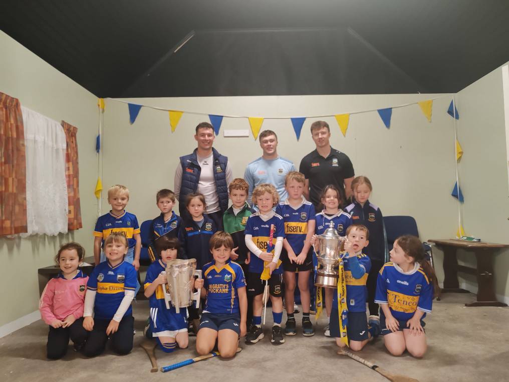 Pupils of Kilruane National School meet Tipp hurling stars Craig Morgan, Jake Morris, and Darragh McCarthy