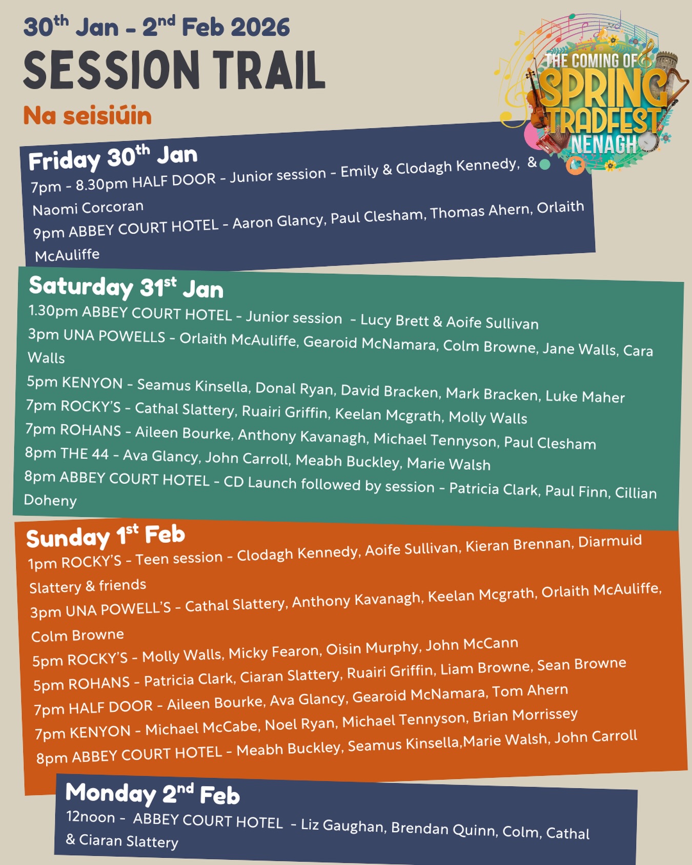 Known in Irish as Féile Teacht an Earraigh, the festival will bring sessions, workshops, concerts and late-night events to venues across Nenagh, with the Abbey Court Hotel serving as the main focal point throughout the weekend.