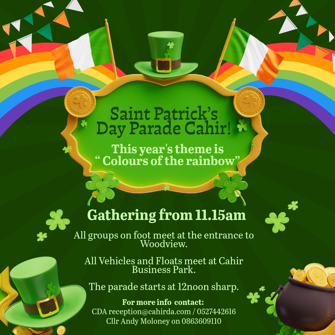 Cahir will mark St. Patrick’s Day this year with a parade under the theme “Colours of the Rainbow.” Festivities are set to begin with participants gathering from 11:15 in the morning.