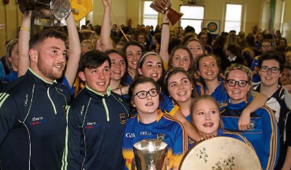 The hurlers and cups were greeted with the melodious strains of Slievenamon led by 3rd year student, Caoimhe Carey and the pupils raised the rafters with chants of ‘Tipp, Tipp, Tipp’, while at the same time showing utmost respect for their hurling heroes.