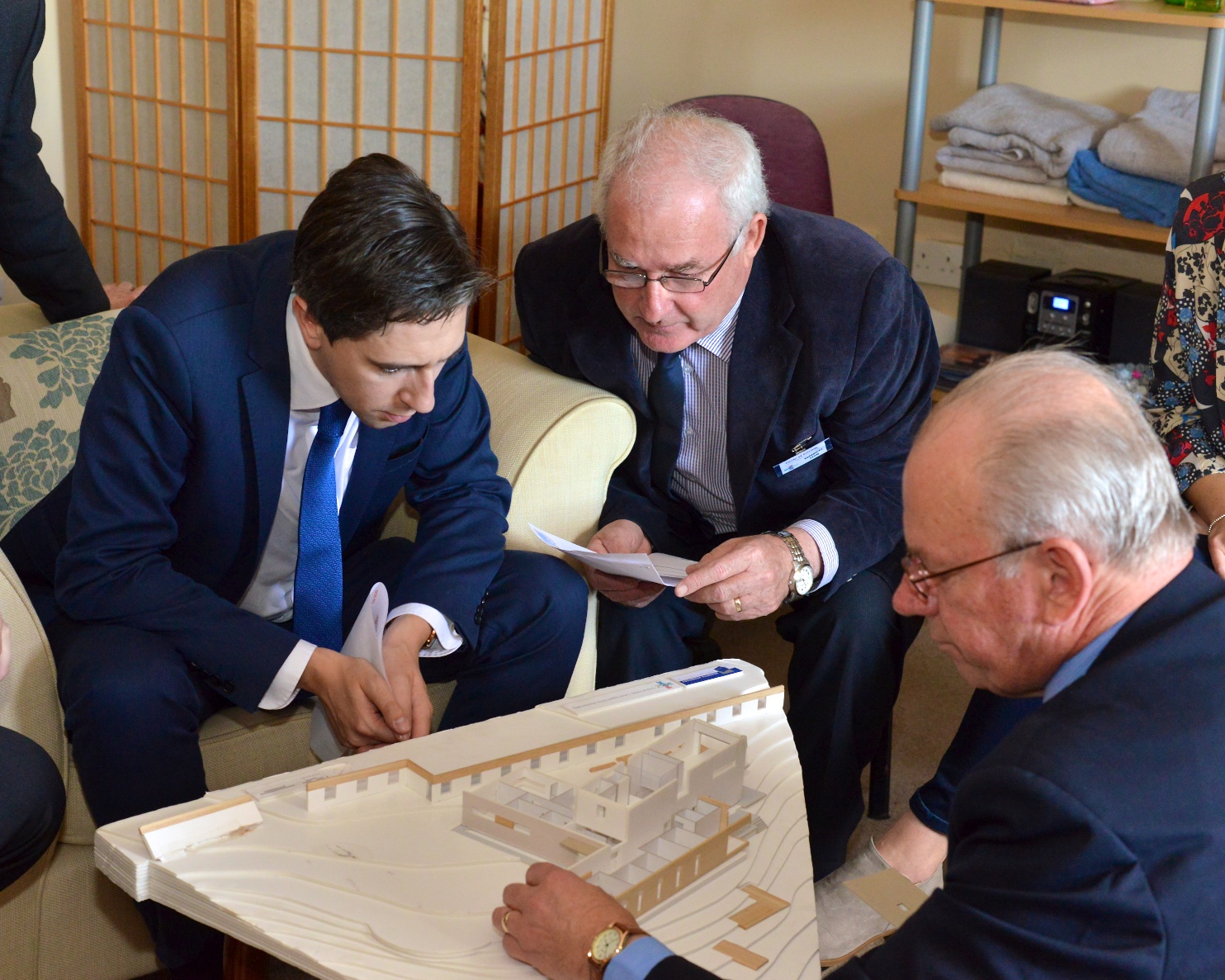 Next stop for the Minister was a visit to the kitchen-dining area where the Minister had the opportunity to mingle with the many service users, volunteers and board members who had gathered for the occasion. In welcoming the Minister, Pat Jones again referred to the benefits of the new Cancer Strategy and thanked the Minister for visiting Circle of Friends. The Minister in reply noted that despite Tipperary being such a competitive county politically, Circle of Friends had succeeded in uniting all political persuasions and he was particularly fulsome in his praise of Centre founder, Jennifer, whose vision and commitment has brought this centre to its present state. The Minister also extended best wishes to board member, Sarah Gleeson, whose passion for Circle of Friends he singled out for special mention. The Minister went on to highlight the excellent services being provided in the centre and expressed his commitment to turn the new centre into an absolute reality. He also drew attention to the fact that more and more people are likely to experience cancer in their lifetime and that there was a need for people to look after themselves and their lifestyles, in particular mentioning the need to encourage girls to avail of vaccine to prevent cervical cancer. Cllr. Fitzgerald also thanked the Minister for his visit and said that the Minister would from now on be part of Circle of Friends. The Minister stated that he was honoured to visit the centre and having concluded the formalities he was happy to stand in for lots of photos. At the conclusion of his visit the Minister was presented with a blanket from the Knit and Natter group Blankets for Friends initiative and Mary Roynane and the Circle of Friends Choir once more serenaded his entourage. Then it was on to Knockanrawley where the Minister unveiled a plaque marking his visit to the site of the new centre. There he met with Mr. Seamus Butler, Marlhill Construction and site manager, Mr. John Hopkins, before Jennifer gave him a guided tour of the new centre. The Minister was deeply appreciative of the progress so far on-site and before his departure, he wished everybody well on what had been a memorable occasion for the cancer support centre.