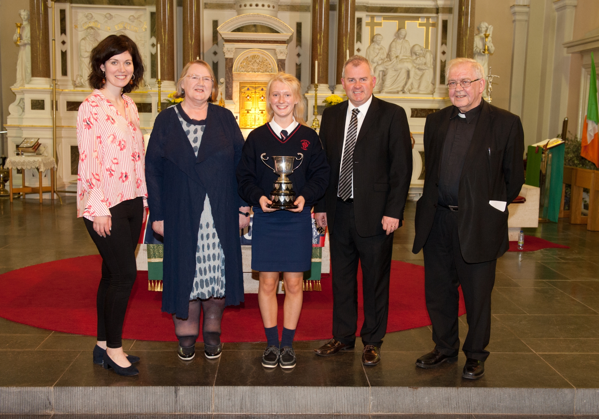 Above - Cailín Napier (centre, Junior Cert Academic Award winner) with (from left) Shannon Forrest (guest speaker), Ethel Reynolds (Principal), Michael O’Loughlin (Deputy Principal) and Fr.Billy Meehan (Parish Priest, St.Mary's) at the annual Presentation Secondary School academic awards ceremony at St. Mary's Church.