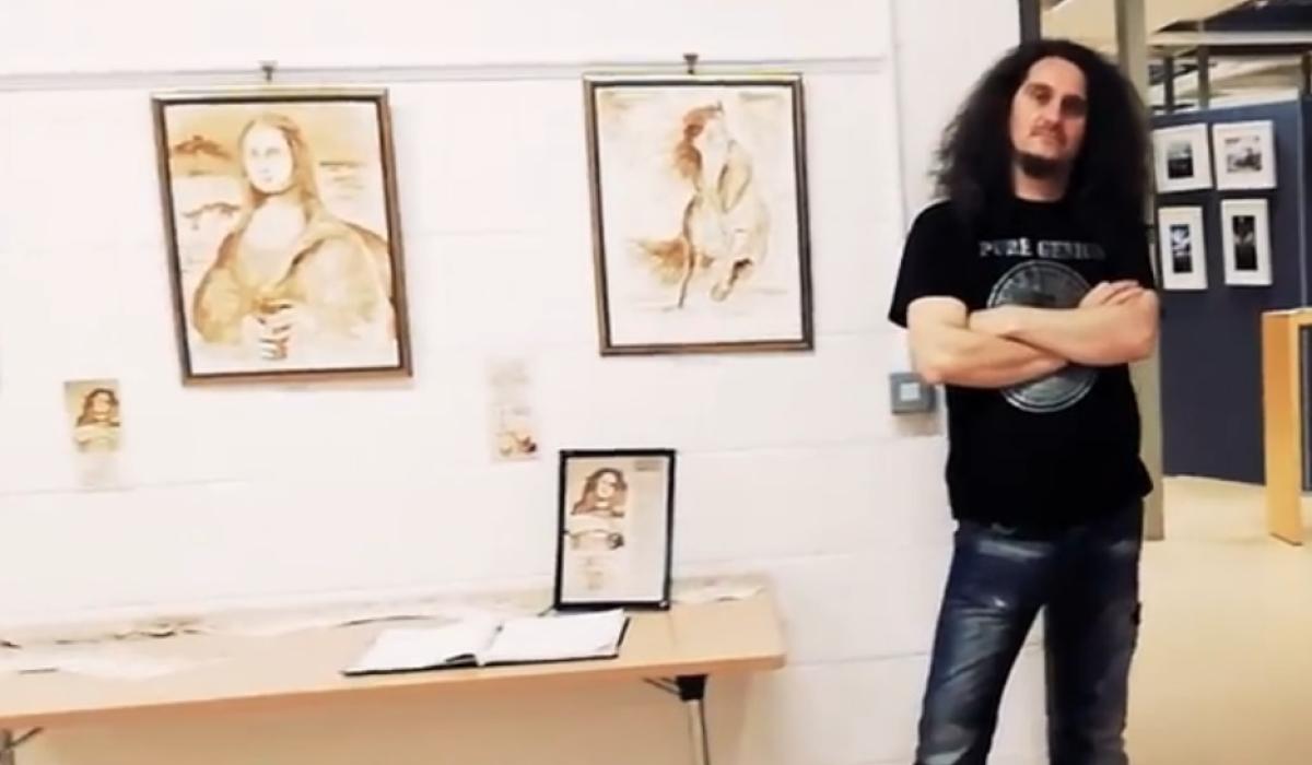 Mike Gale with his exhibition of paintings using Guinness as a medium