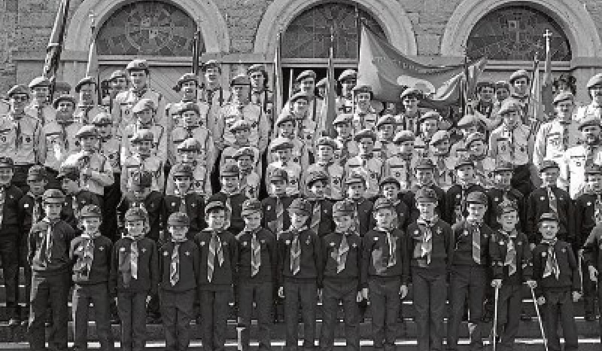 Fethard & Killusty Boy Scouts, 27th Tipperary Unit, photographed with leaders on the occasion of their First Investiture outside Holy Trinity Parish Church in May 1987