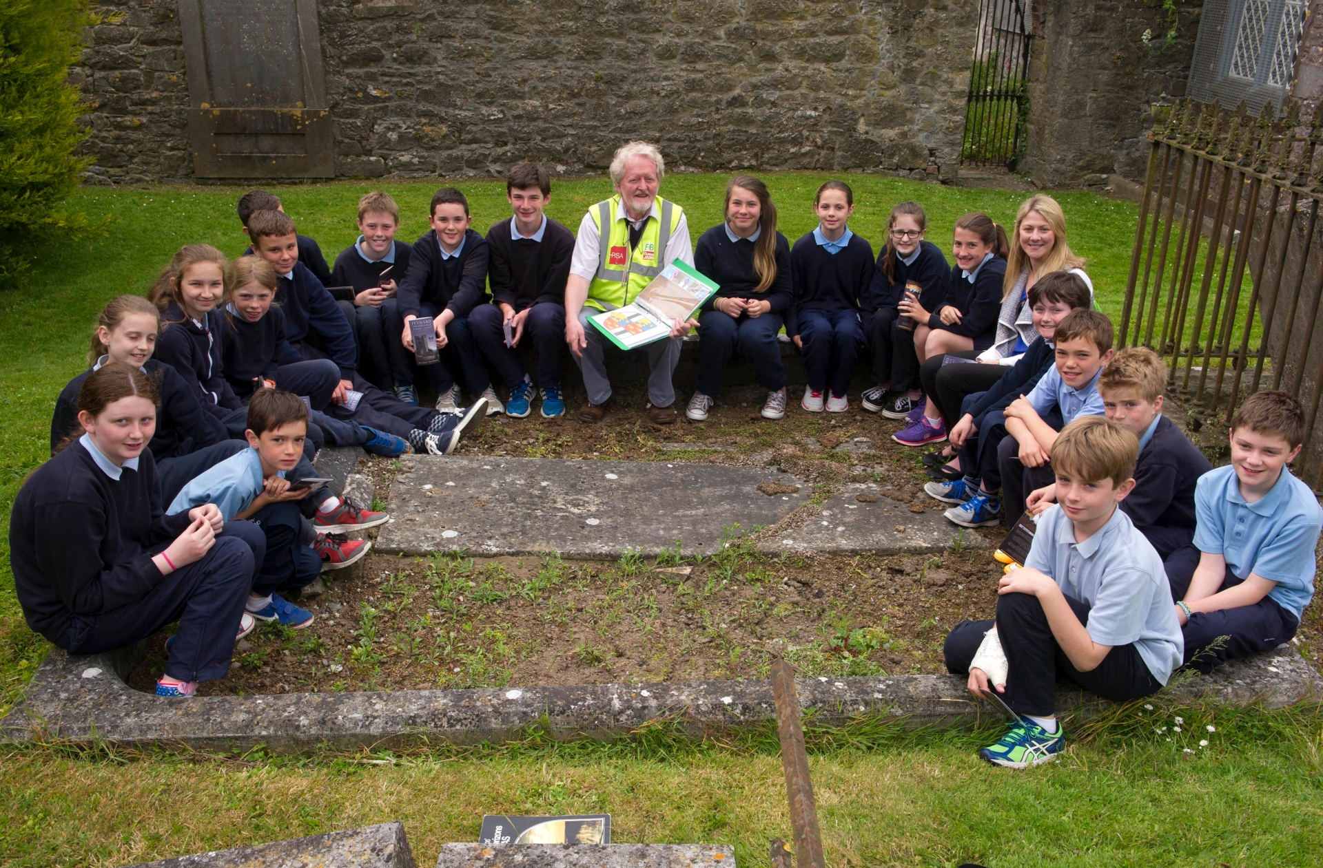 Above: Pupils from Lisronagh National School, with their teacher Carmel Armstrong, photographed in 2015 with guide Terry Cunningham at the grave of Sir Henry Kellett in the grounds of Holy Trinity Church of Ireland in Fethard. Picture: Joe Kenny