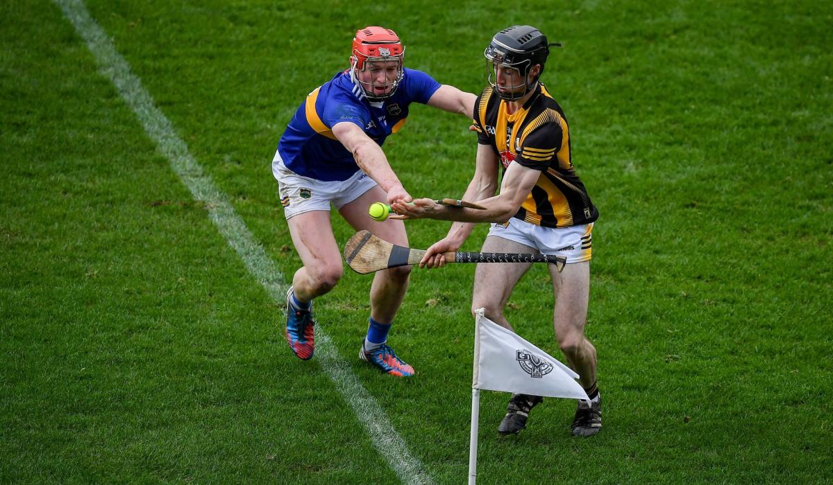 Tom Phelan of Kilkenny handpasses the sliotar as he is tackled by Dillon Quirke of Tipperary during the Allianz Hurling League Division 1 Group B match between Tipperary and Kilkenny at Semple Stadium