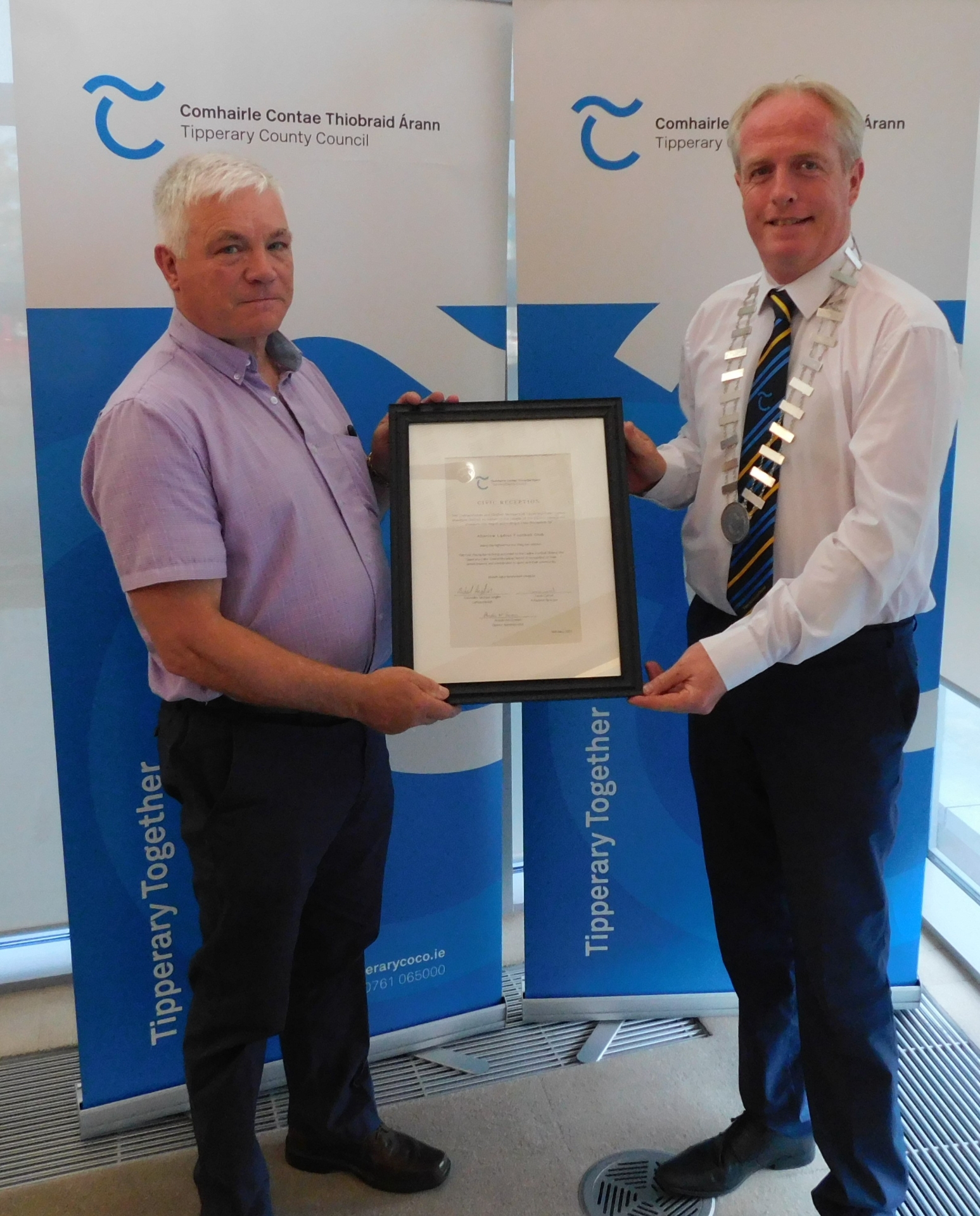 On Friday May 26, the Cathaoirleach Councillor Micheál Anglim and the elected members of the Tipperary - Cahir - Cashel Municipal District accorded a civic reception to the Ladies Football clubs in their district areas in the Council Chamber of the Civic Offices at Rosanna Road, Tipperary Town.