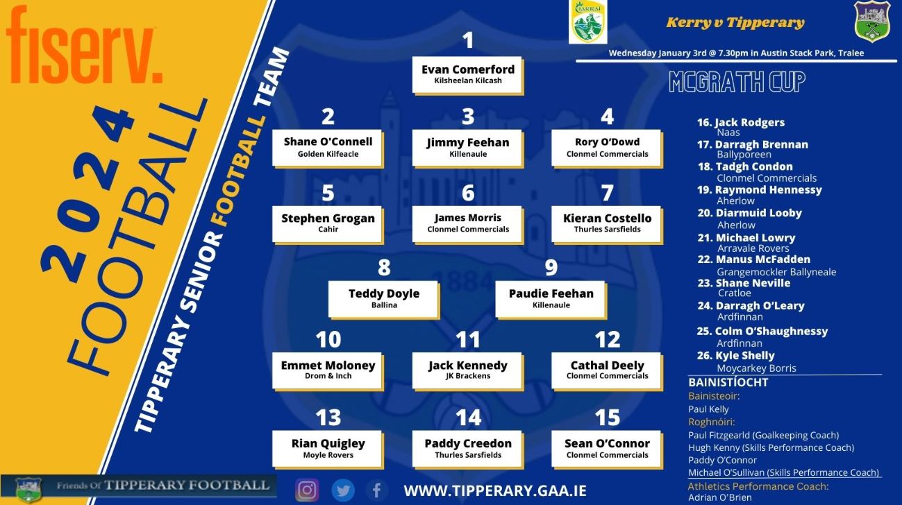 Paul Kelly has named his first Tipperary football team for tomorrow's McGrath Cup opener away to Kerry in Austin Stack Park.