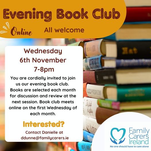 As the evenings shorten Family Carers Ireland are invited people to join an evening book club on Wednesday 6th November from 7-8pm. New members are welcome. Contact Danielle at ddunne@familycarers.ie for more information.