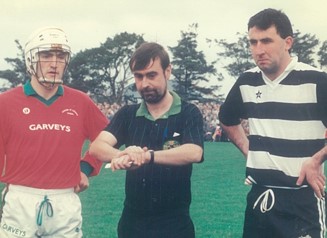 PICTURE BELOW: M. Quinn (Referee) about to throw in the ball before the Munster Club final at Mitchelstown, December 1991. Cashel King Cormac’s captain, Colm Bonnar, and Midleton captain, Ger Fitzgerald.