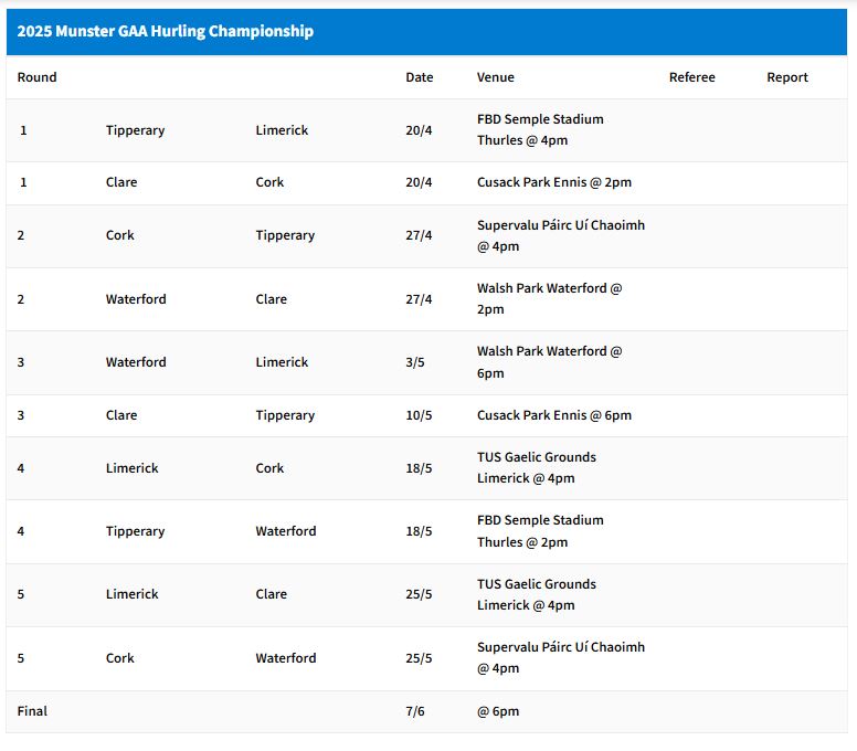 Both Round 3 games will take place on Saturday evenings at 6pm with Waterford hosting Limerick on May 3rd and Clare hosting Tipperary on May 10th. The Munster Senior Hurling Final will take place on Saturday, June 7th with a 6 pm throw-in time.