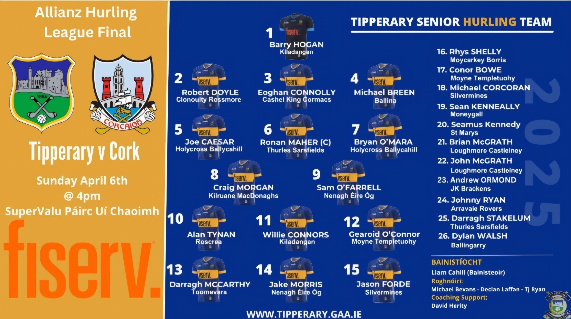 The Tipperary team aiming to end a 17-year wait to win a league title has been named by manager Liam Cahill ahead of Sunday's Allianz National Hurling League final clash against Cork.