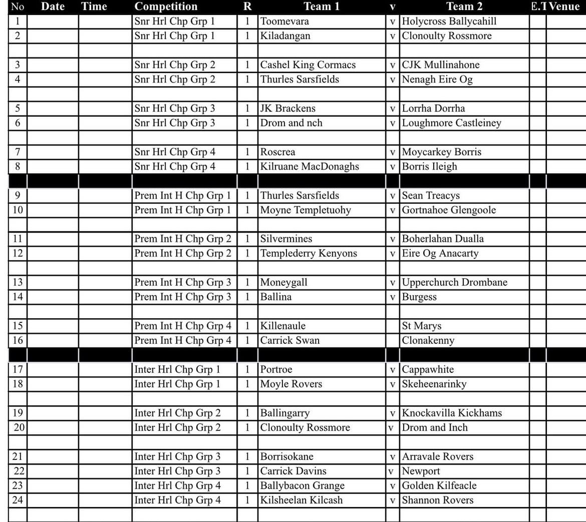 The fixtures for the opening exchanges of the 2025 FBD Insurance County Tipperary Club Hurling and Football Championships were made on Wednesday night last.