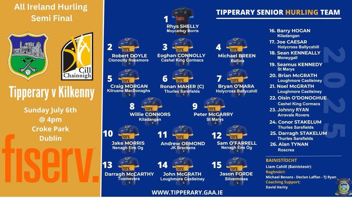 The Tipperary senior hurling team to face Kilkenny in this Sunday's All-Ireland Senior Hurling Championship semi-final has been revealed.