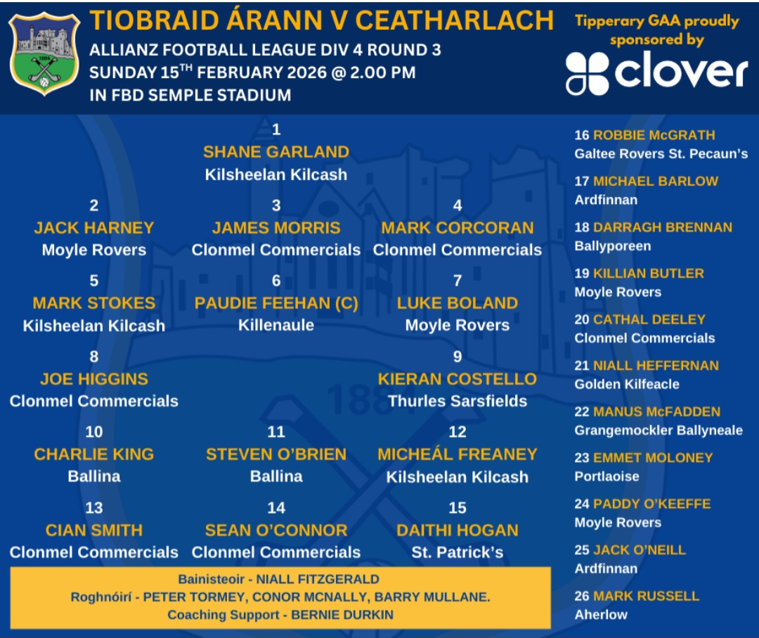 Overall, there are three changes to the team which clinched Tipperary's first win over Antrim in Moneygall a fortnight ago, with Mark Corcoran, Micheal Freaney and Steven O'Brien coming into the team in place of Cathal Deeley, Eoin Craddock and Eoin O'Connell.