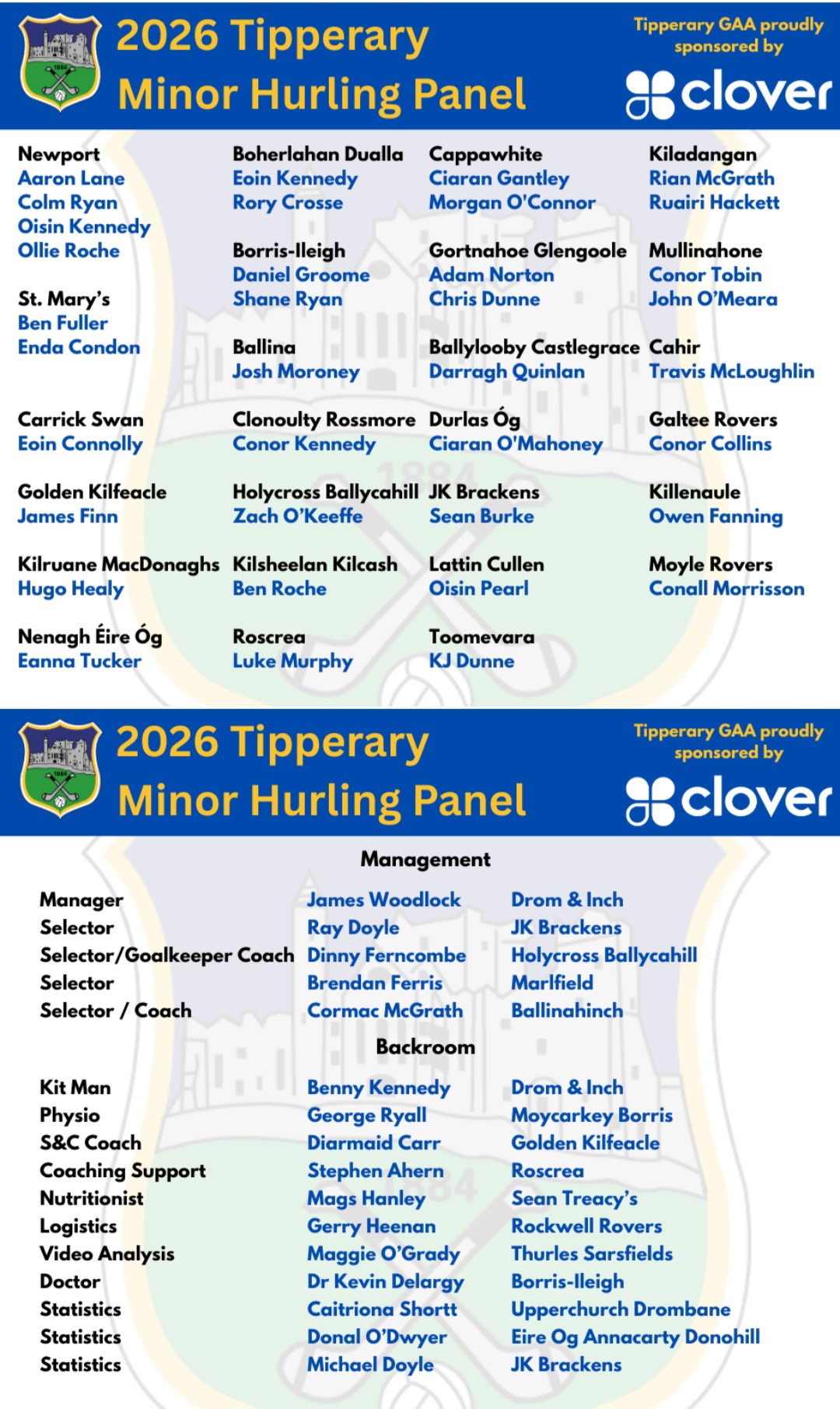 James Woodlock has named his Tipperary minor hurling panel for 2026 ahead of the commencement of the Electric Ireland Munster Hurling Championship in April.