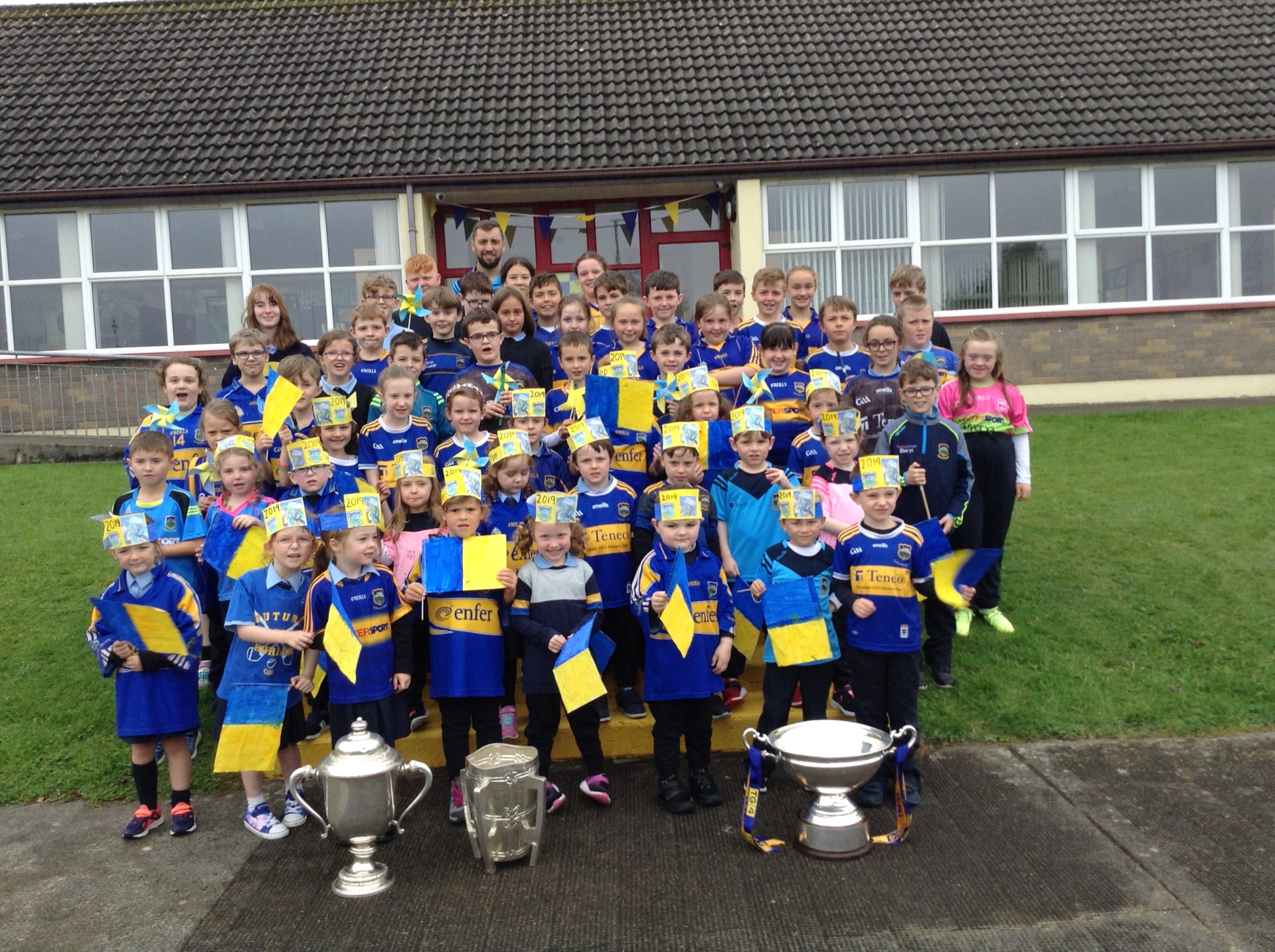 Pupils from Rearcross NS decked out in their county colours give an enthusiastic welcome to James Barry and the three All Ireland cups, the Liam McCarthy, the Under 20 Hurling and the Ladies Intermediate football cup when they visited the school last week