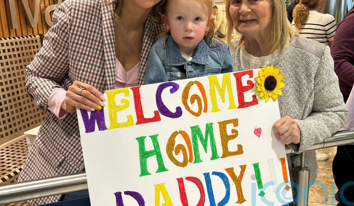 Lisa Cunningham and her three-year-old daughter, Lucy McManus, held a “welcome home daddy” sign as they waited for her partner and Lucy’s dad, Neill McManus to arrive through the doors.
