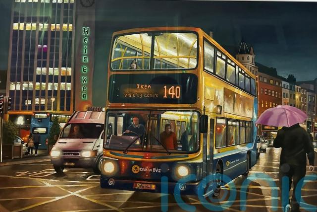 He now spends his time creating night street scenes, unusually using gouache – an opaque water colour, including an evocative image of a rainy night in Dublin’s Dame Street.