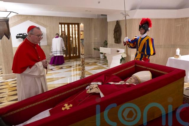 Francis’s body was pictured lying in a private chapel in a wooden coffin dressed in red, with rosary beads draped across his hands.