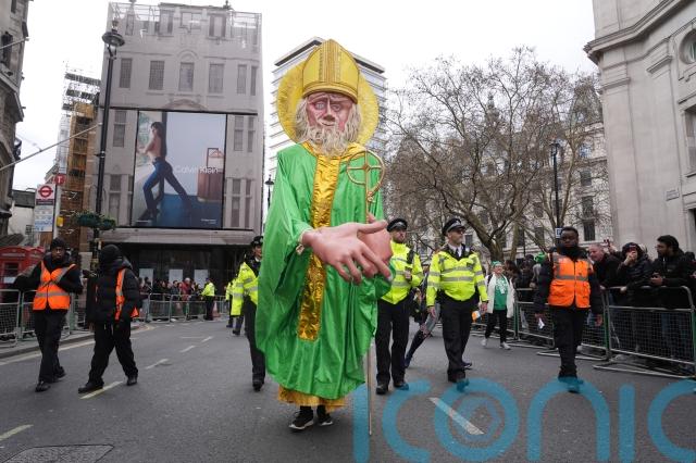 A parade including marching bands, dancers and a giant model of the Irish patron saint wove its way from Hyde Park to Trafalgar Square on Sunday.