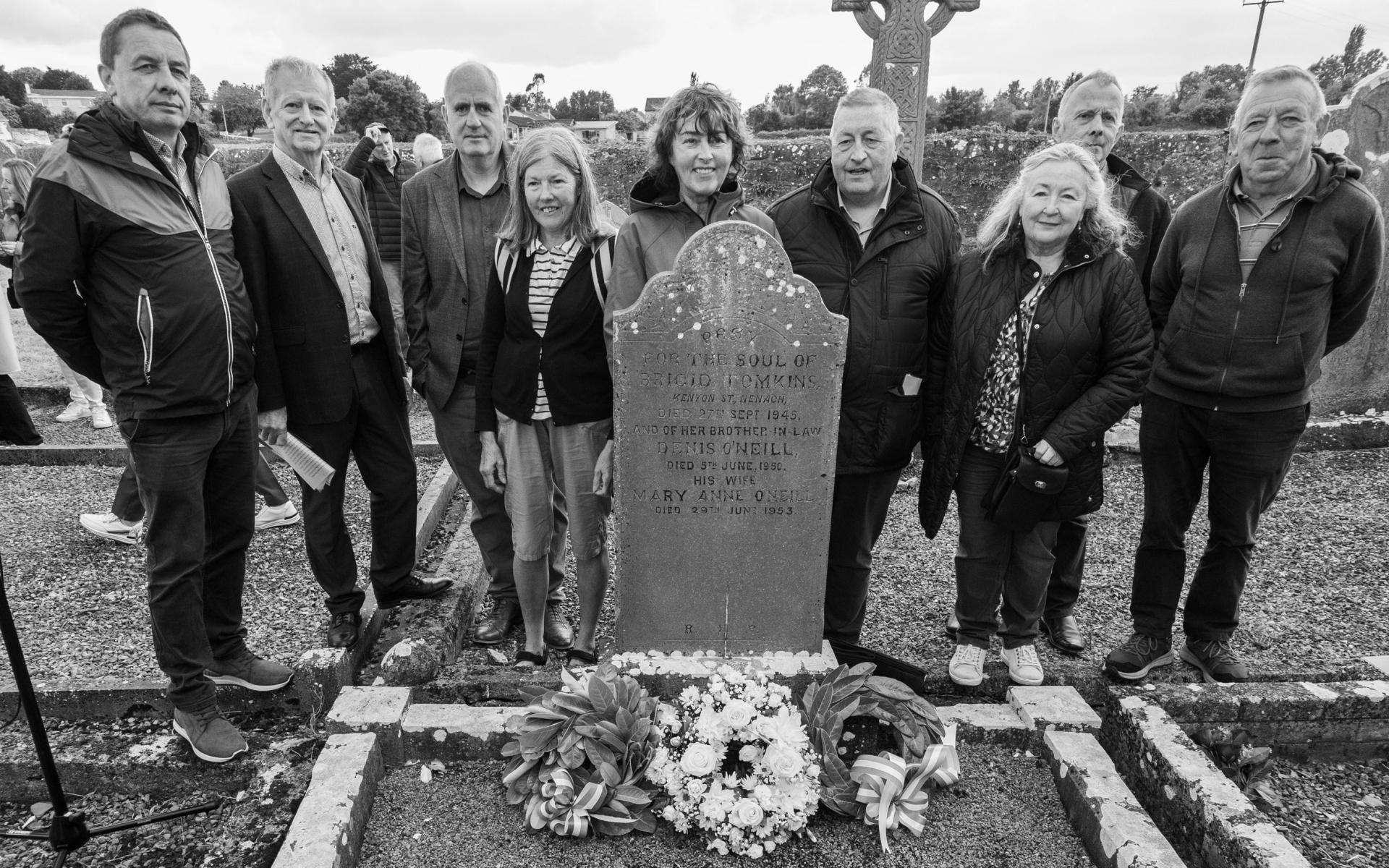 L-R Sean O’Connor Chairman Kilbrittain Historical Soc, John Flannery Tipperary in the Decade of Revolution, Neil Collins-Powell G Grandnephew of Michael Collins, Grainne Barrett Tres KHS, Maura O’Neill G Grandniece of Denis O’Neill, John Sheehy MC Margaret Kennedy TiDR, Tim Crowley Michael Collins Centre, John Connors TiDR at Sonny O’Neill’s grave.
