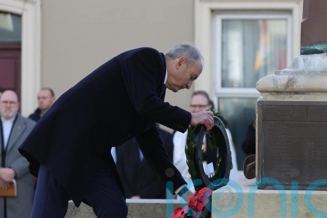 In Dublin, outgoing Irish President Michael D Higgins marked his penultimate day in office by laying a wreath at a remembrance service at St Patrick’s Cathedral.