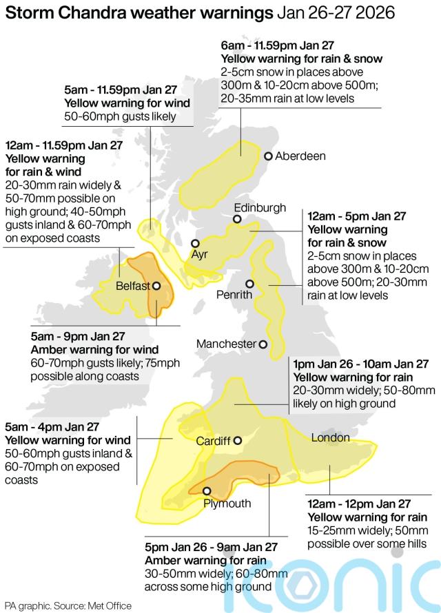 The Met Office said rainfall totals of 20-30mm are “likely fairly widely”, with 50-70 mm possible on high ground especially in eastern areas.