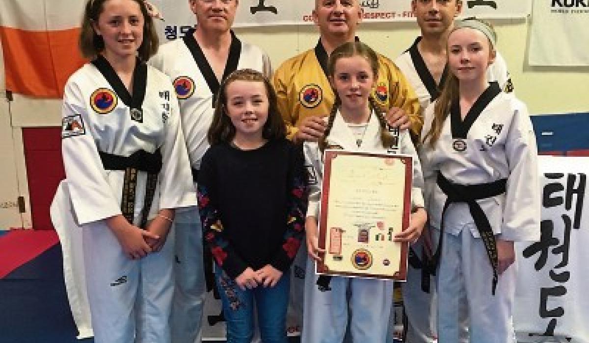 Leanne’s Dad Greville is an Instructor in the Thurles Training Centre. Leanne’s sister Amy is also a Black Belt and their other sister Rachel is Red Belt Black Strip. Anybody interested in starting World Taekwondo Association classes can do so in Halla na Feile. Kids 7.15pm-8:15pm. Adult and Youths 8.15pm -9:15pm Mondays and Thursdays. Pictured above, back Row L/R: Maia O’Sullivan, Instructor Greville Stockil, Master Sheamus O’Neill, Derek Joy. Front Row, Rachel Stockil, Leanne Stockil, Amy Stockil.