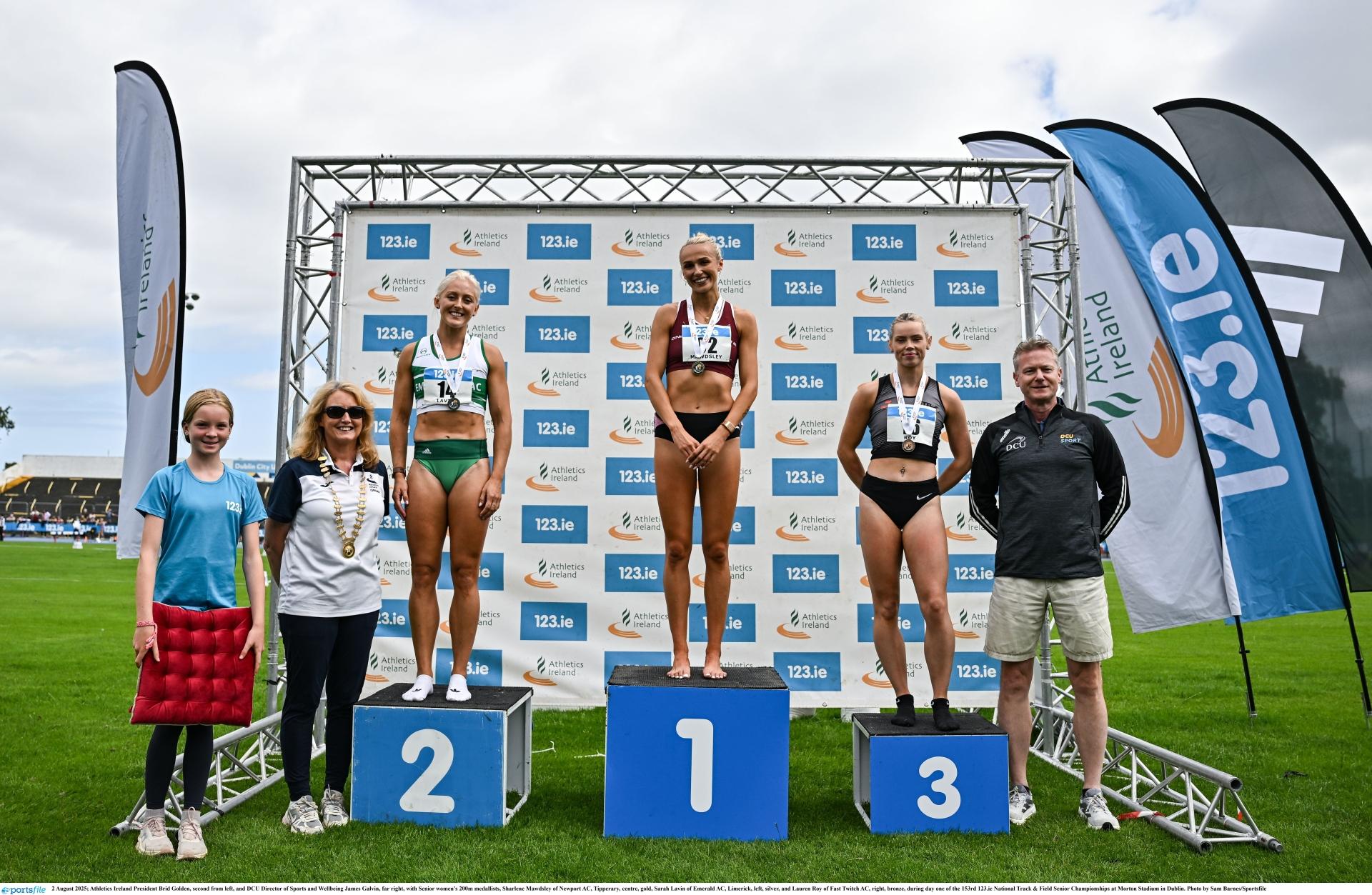 Sharlene Mawdsley, in front of Tipperary All-Ireland winning hurler and boyfriend Michael Breen, crossed the line into a stiff breeze in 23.55 (-2.6 m/s)