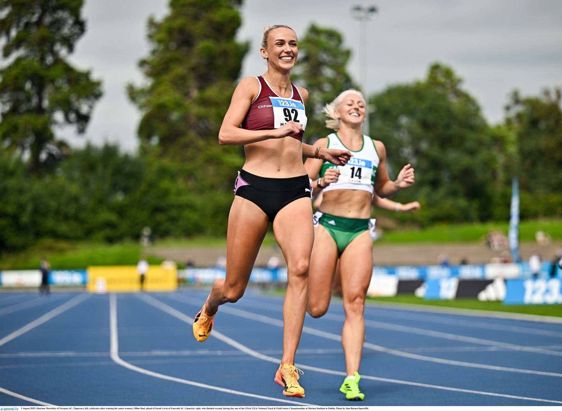 Sharlene Mawdsley, in front of Tipperary All-Ireland winning hurler and boyfriend Michael Breen, crossed the line into a stiff breeze in 23.55 (-2.6 m/s)